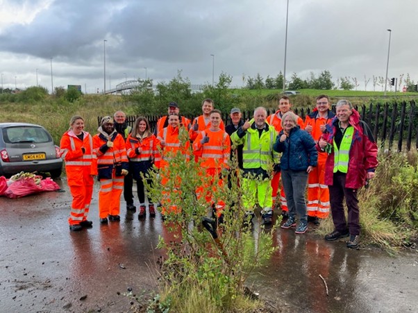 September 2025 - Scottish Roads Partnership & Amey assist Community in Tending to Area of 1,000 new native trees & shrubs.