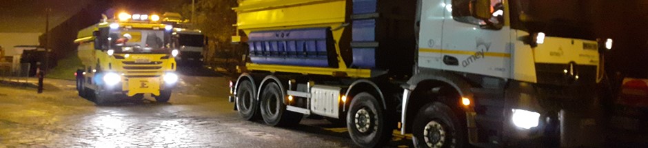 Photograph of Amey gritters leaving the yard in the early hours of 4th November going out on Scottish Roads Partnership network (M8 M73 M74 Motorway Improvements Project). This is the first gritter patrols of the winter season for 2020/21.
